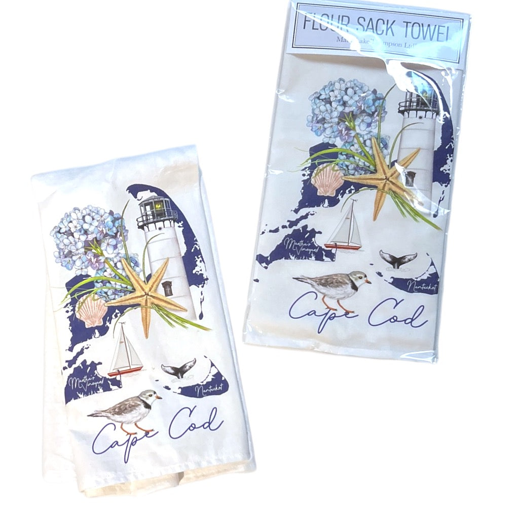 This beautiful Cape Cod Hydrangea Towel is a hand-folded flour sack towel featuring a lovely blue hydrangea design filled with other prominent Cape Cod icons and it's souvenired, Cape Cod. Designed, packaged and printed in the USA on towels made in India, this is a wonderful depiction of the colors of Cape Cod's gorgeous hydrangeas.