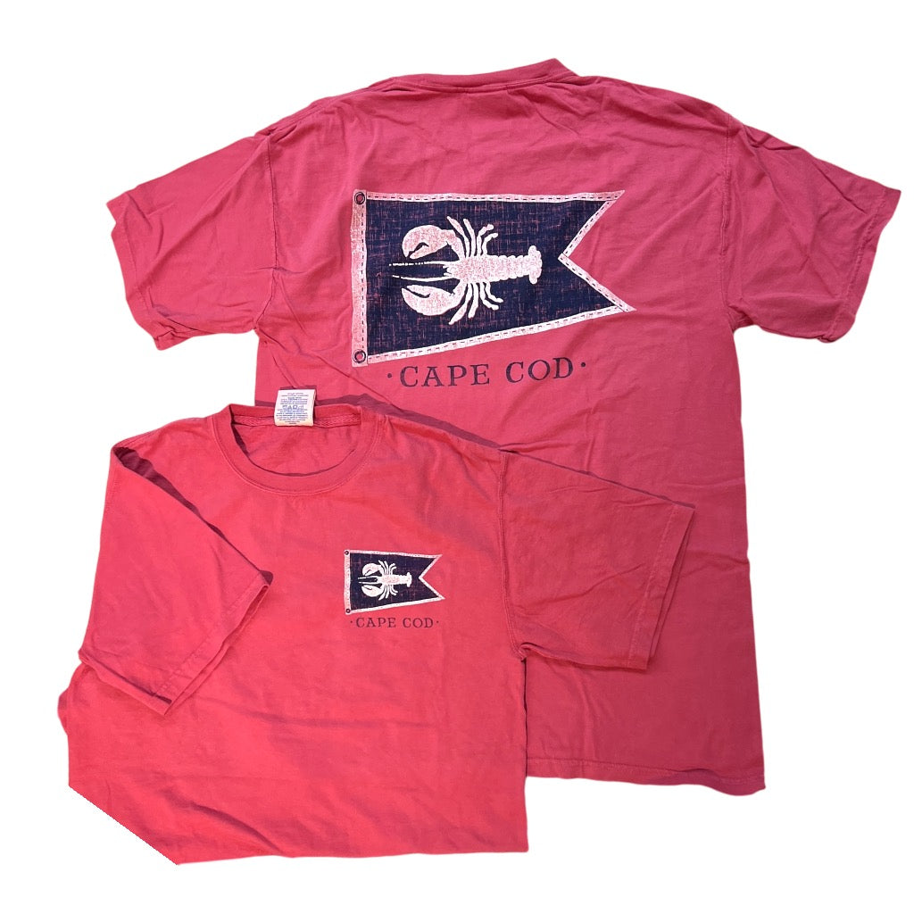 Unleash your love for Cape Cod with our locally screen-printed Lobster T-Shirt! The quintessential Cape Cod T-shirt is made with 100% ring-spun cotton. This Comfort Wash Nantucket Red tee features a striking nautical lobster pennant design on the front and back. Show off your passion for the Cape and its iconic lobster in style.