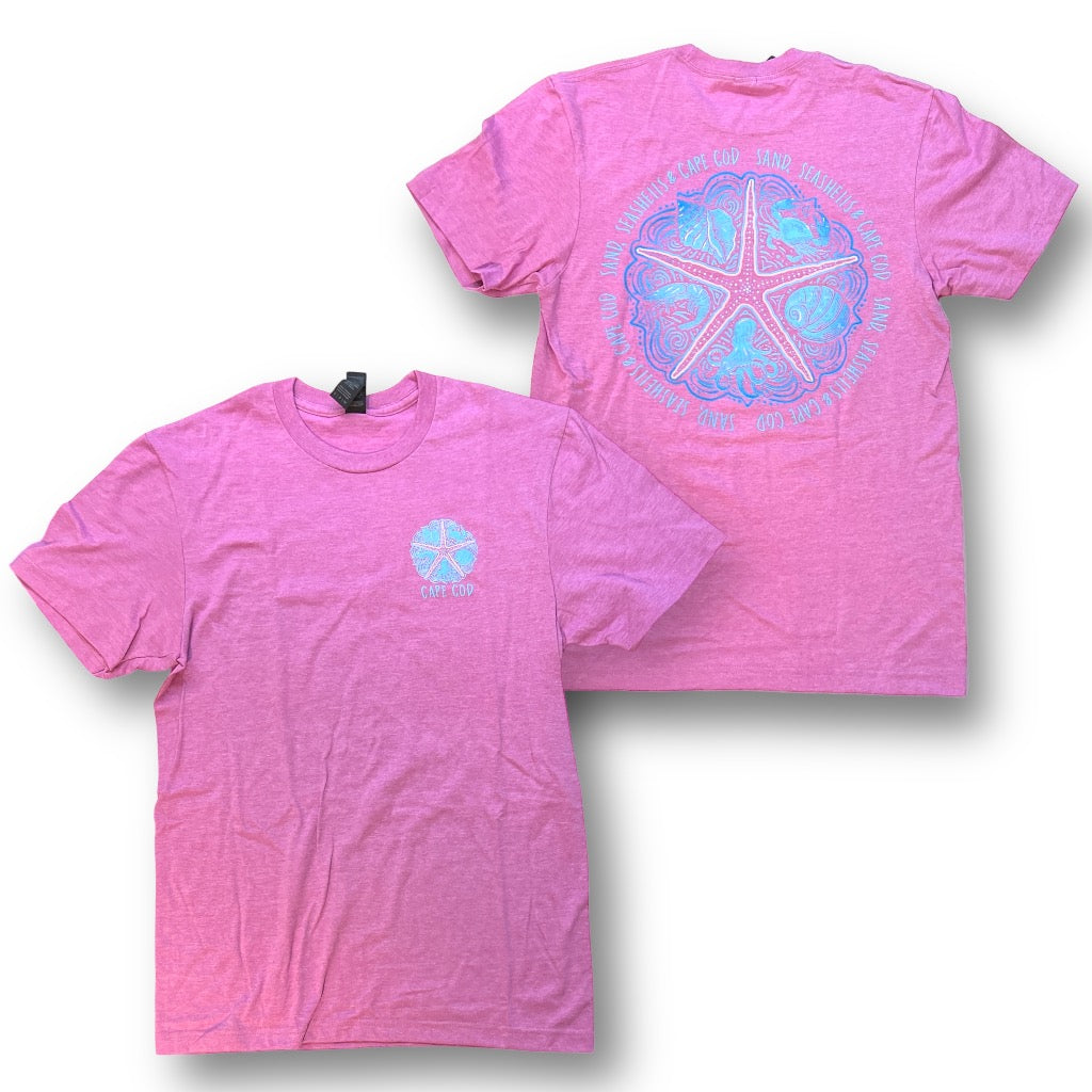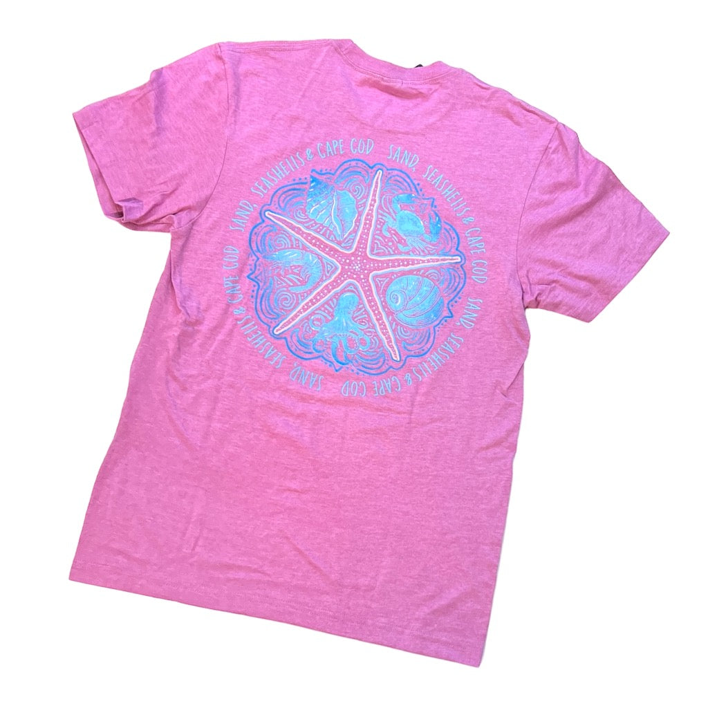 Introducing our Cape Cod Seashells T-Shirt, perfect for any beach lover! The vibrant aqua blue ombré screen-printed design features a large starfish surrounded by seashells, crustaceans, and even an octopus on a heathered radiant orchid colored tee. Made with a blend of 35% cotton and 65% polyester, this gorgeous Cape Cod T-shirt is comfortable and stylish in women's sizes small to XXL. Get ready to show off your love for the Cape in our raspberry-colored "sand, seashells, and Cape Cod" design!