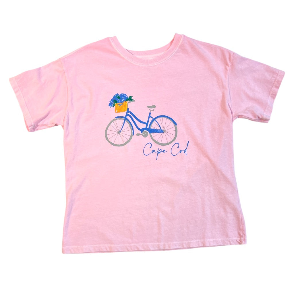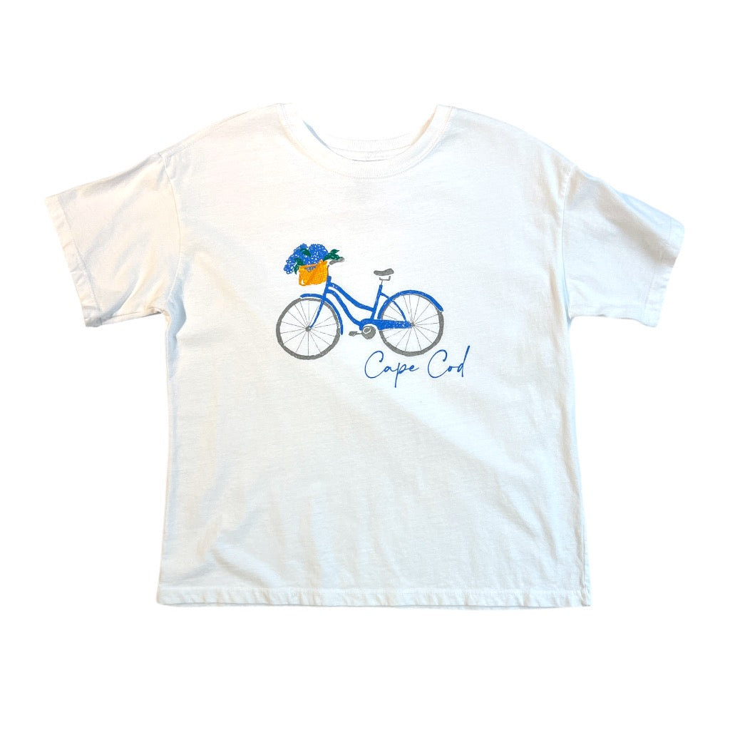Indulge in the luxurious comfort of this 100% cotton Cape Cod Hydrangea cropped tee, adorned with a stunning screen-printed bicycle and hydrangea basket design.
